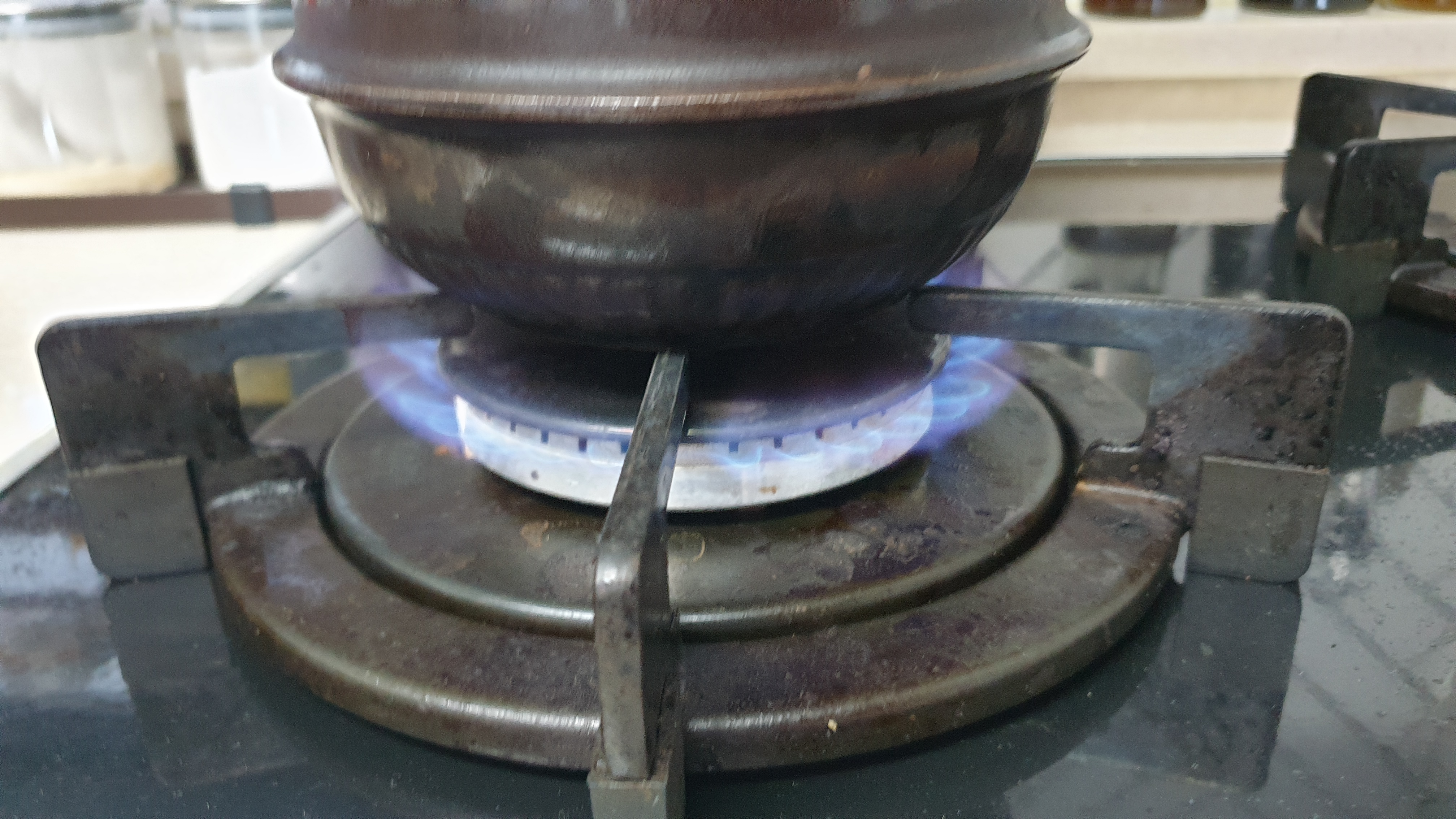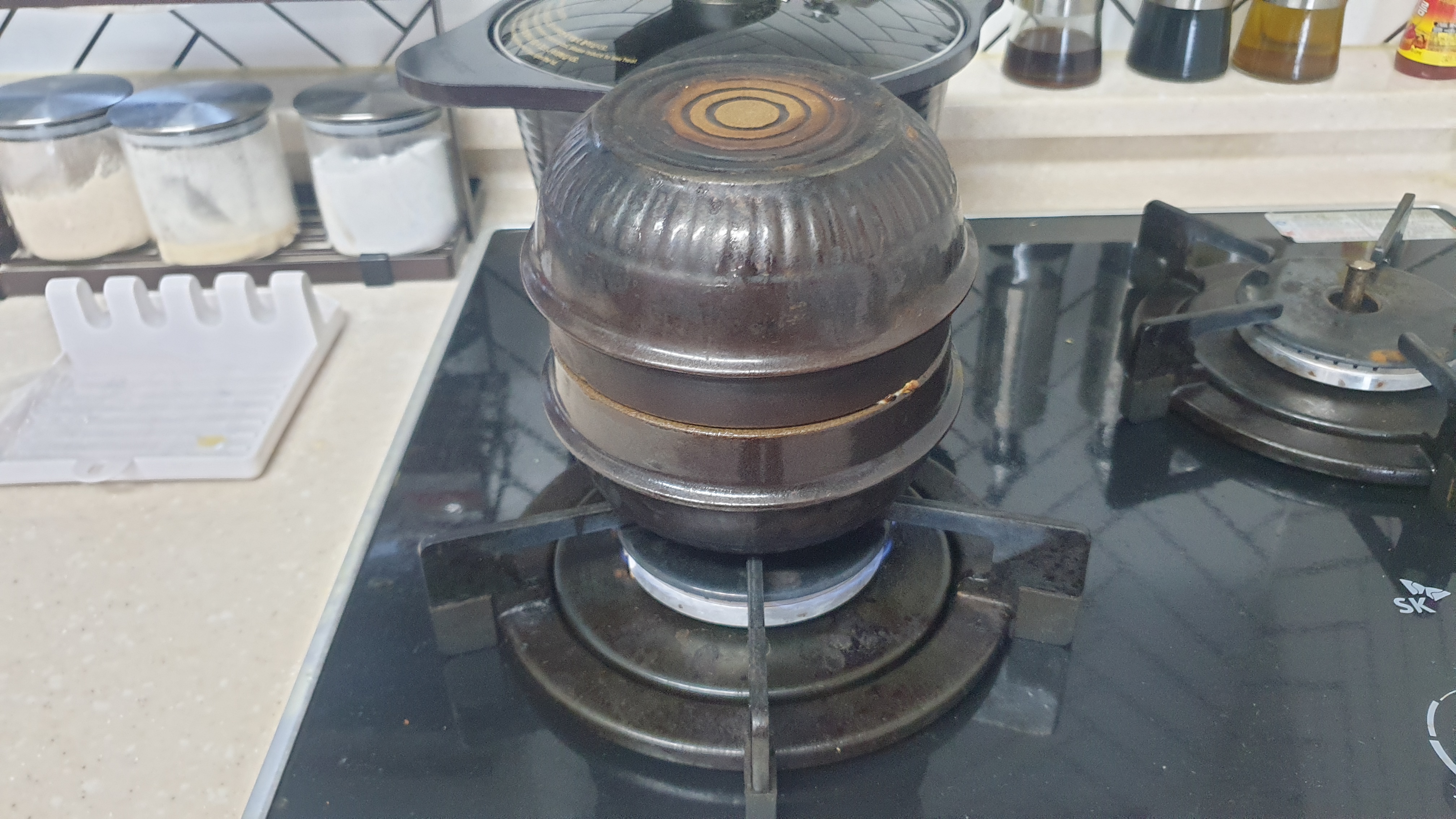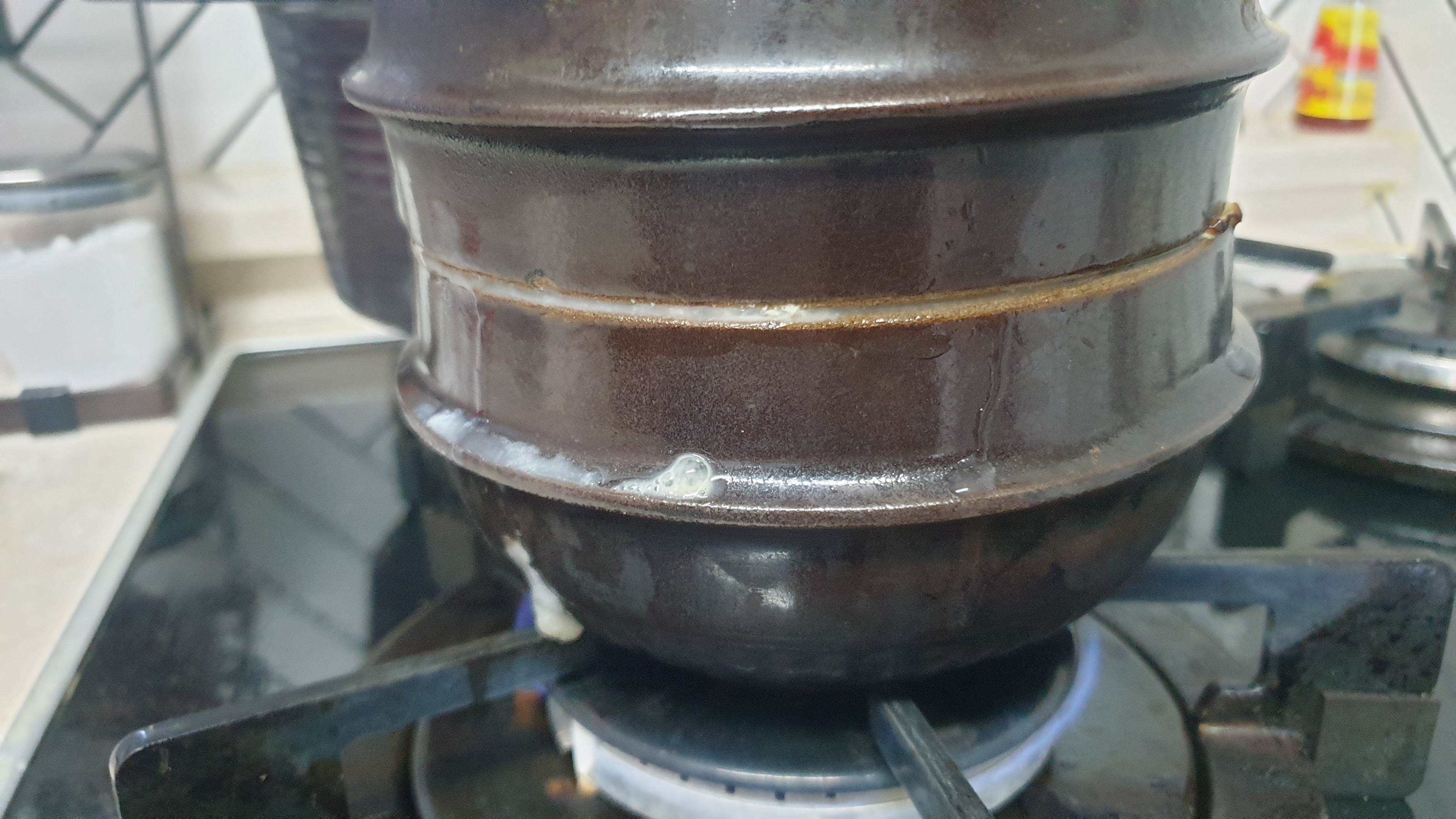 1분이 지나 2분으로 넘어갈 무렵 되면 내부에 고여있던 수증기들이 흘러서 뚝배기 틈새로 빠져나옵니다.. 바로 불 끄지 마시고 좀 기다렸다가 살짝 탄내가 나오면 불을 끕니다.. 시간으로 따지면 대략 2분 30초에서 3분 사이가 될 겁니다..