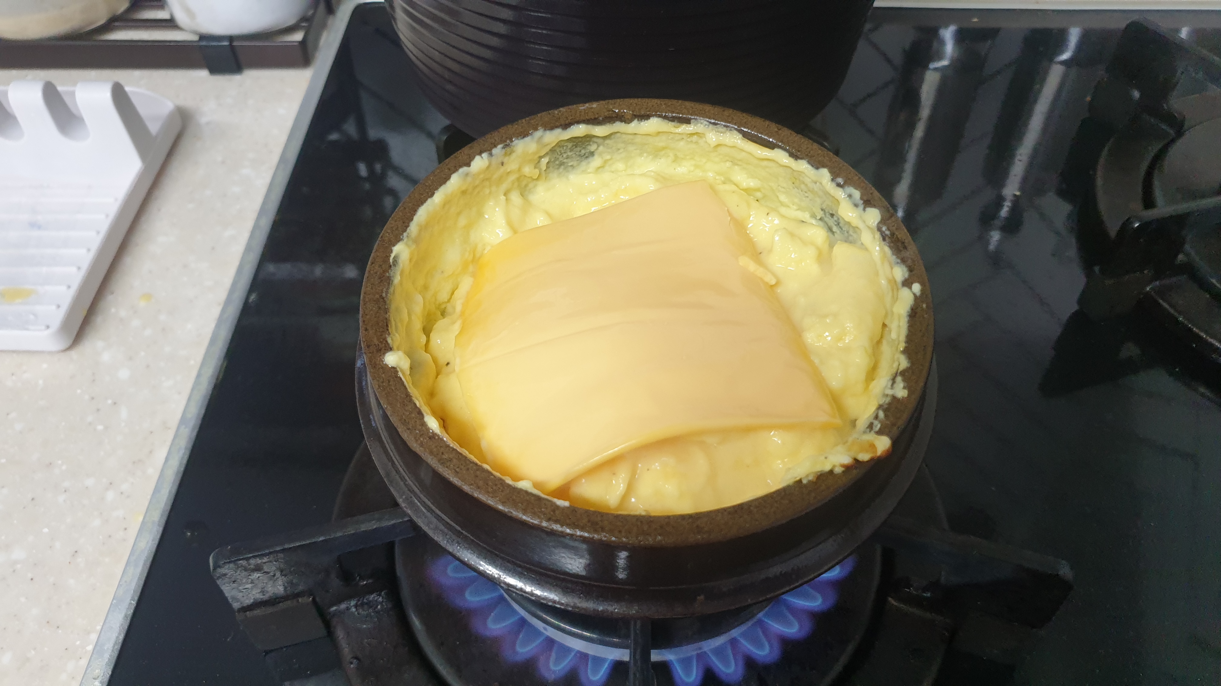 경건한 마음으로 사각 치즈를 한 장 올리고 불을 약불로 조정합니다..