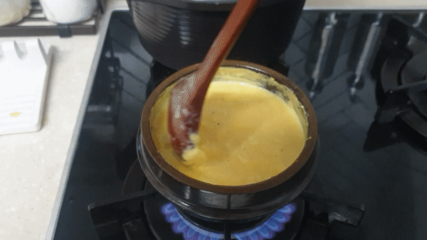 지금부터는 끈기가 필요합니다.. 바닥이 타지 않도록 부지런히 저어줍니다.. 가장자리부터 눌어붙기 시작하니 저렇게 가장자리를 돌려가면서 저어 줍니다..